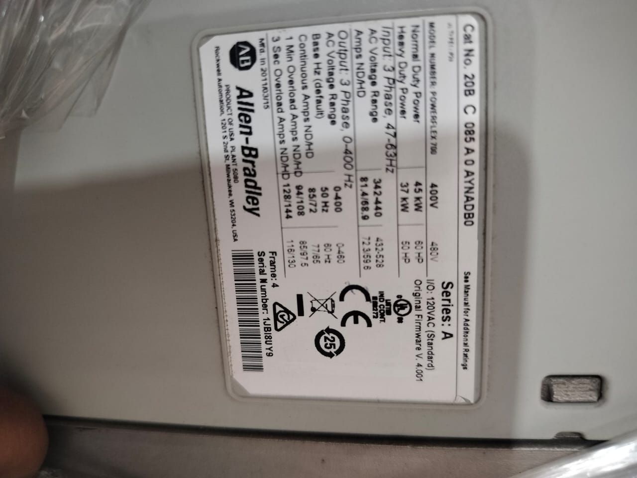 Allen Bradley 20BC085A0AYNANB0 Powerflex 700 AC Drive 85 A 45 kW 20B